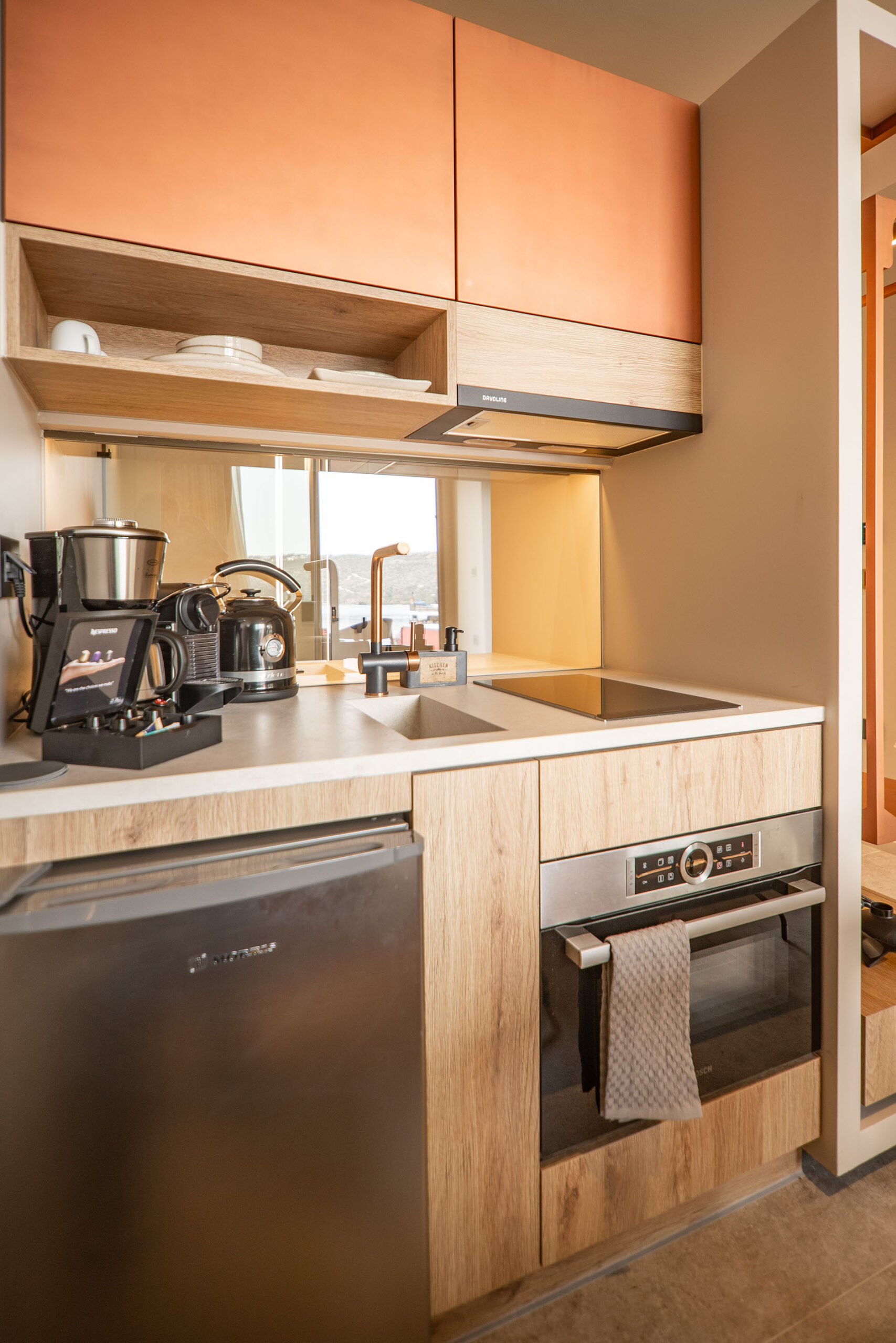 The Oniros Suite with an area of 48 sqm features a balcony with a sea view, a jacuzzi, fully equipped kitchen, separate comfortable bedroom, living room with smart TV, Playstation 5, and two spacious bathrooms.